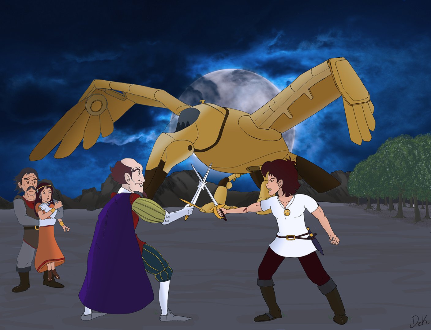 Dek, bravo pour ton dessin, j'aime l'expression des personnages et j'adore le condor sur fond de pleine lune(allez savoir pourquoi..) en revanche les arbres sur le côté font un peu bouche-trou, et les couleurs sont un peu trop soutenues à mon goût.