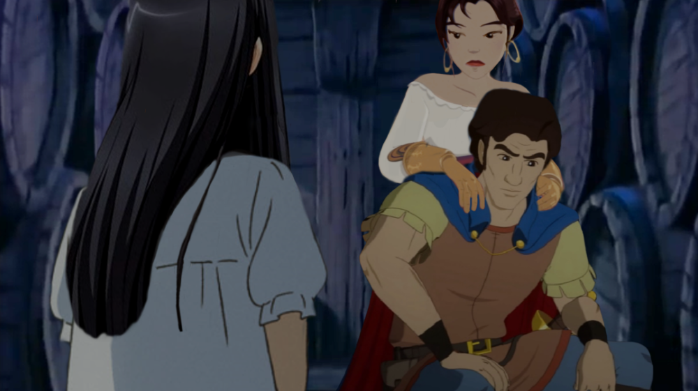 Une fois parvenu dans le cellier, Mendoza alla s'asseoir sur un petit baril. Le couple n'avait plus qu'à attendre la venue d'Elena. Ils ne patientèrent pas longtemps car cinq minutes plus tard, la porte s'ouvrit et l'adolescente entra. Elle portait dans un panier le repas que son père prenait souvent sans quitter la cave, quand il avait en effet trop d'ouvrage.