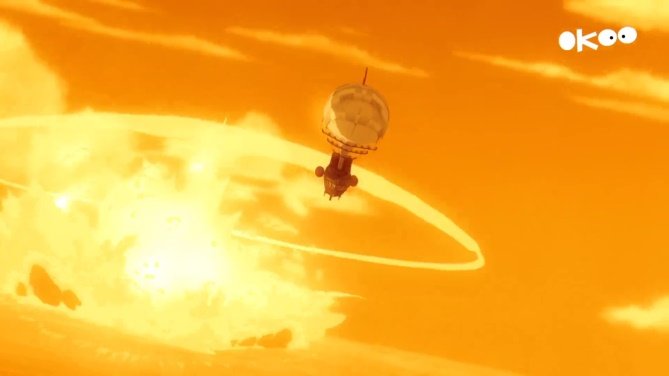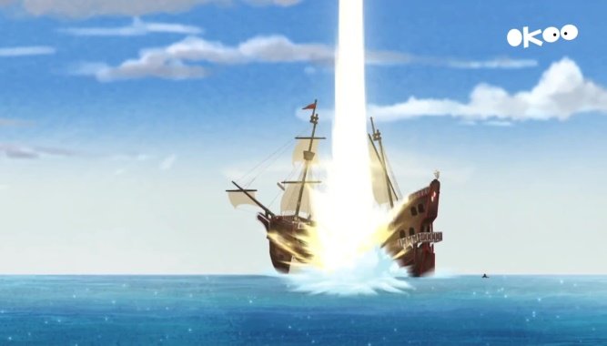 Mais la puissance de l’explosion c’est disons variable… Surtout qu’on a vu les premières explosions dans l’eau et c’été loin d’être très gros, mais dit que c’est à côté du navire c’est titanesque, et non je doute que les barils de poudre d’un navire fasse une explosion pareil. Surtout qu’on insinue bien que c’est la puissance de l’orichalque.
