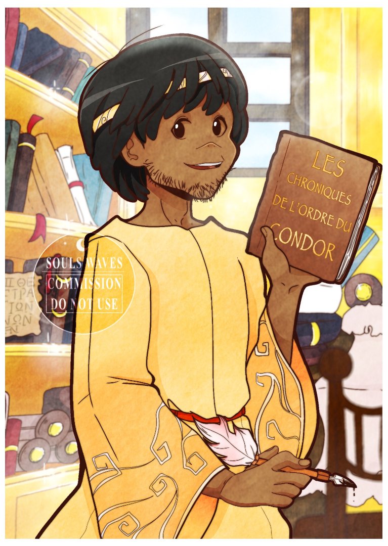 Mais l’homme qui vient d’entrer dans la pièce ne prête plus attention à ces tablettes, ayant déjà depuis longtemps, lui et ses amis, percé leurs secrets… Il referme la porte derrière lui et s’avance d’un pas tranquille vers le bureau, le bas de sa magnifique chasuble dorée, ornementée de symboles muens, traînant presque sur le sol. Il s’assied sur le siège, des plus confortables, prend délicatement l'un des livres disposés sur le meuble et l’ouvre... Les pages complètement vierges, le tome n’attend plus que le bon vouloir de son propriétaire... Ce dernier réfléchit longuement, frottant sa barbe de trois jours de ses doigts, ce qui le distrait un instant.