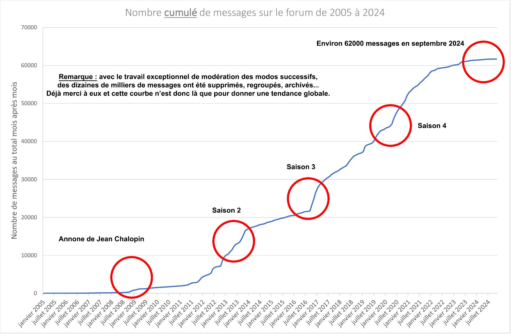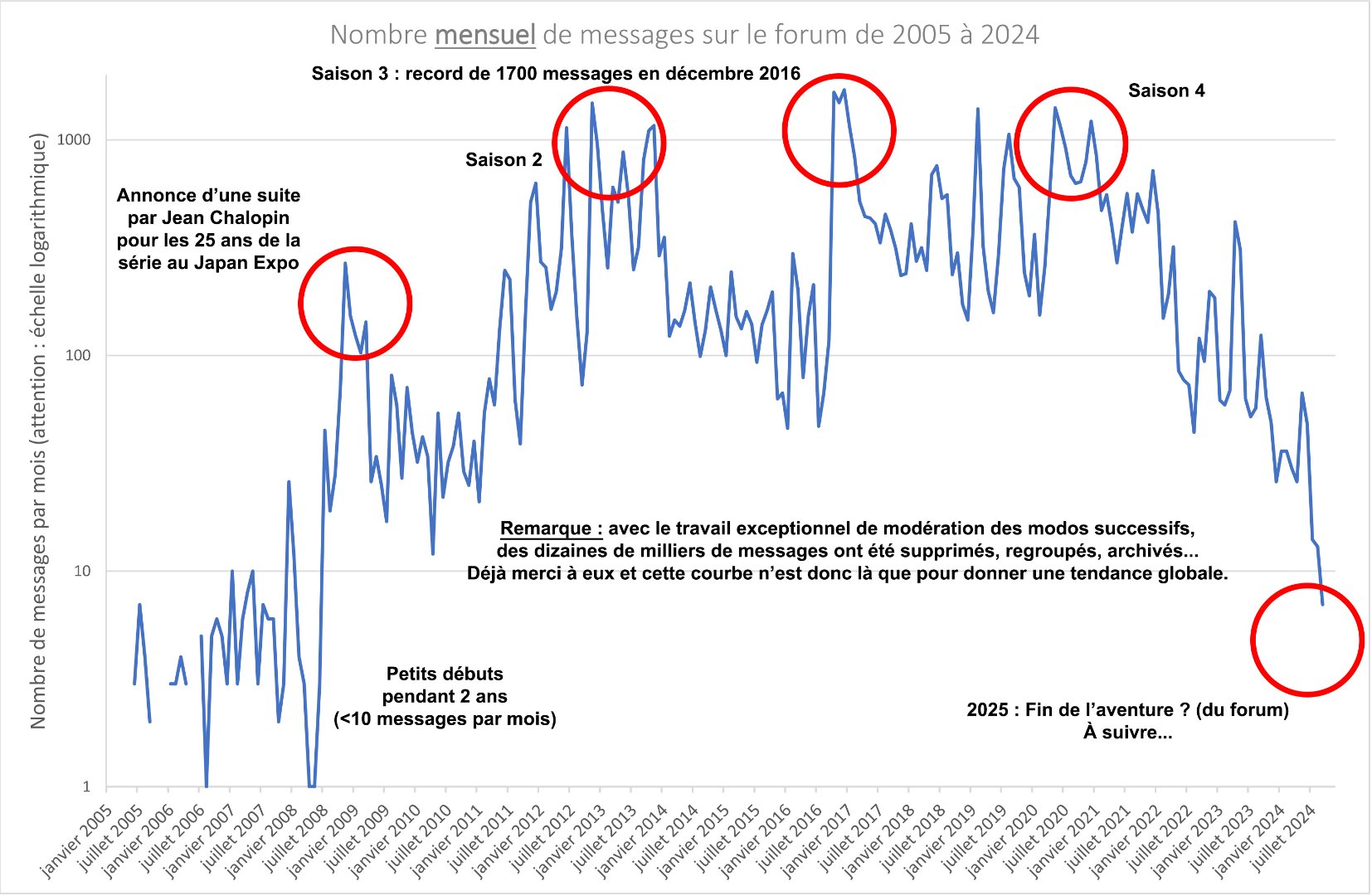 L'occasion de présenter 2 courbes sur l'évolution de la fréquentation du forum, depuis son ouverture en 2005, il y a bientôt 20 ans