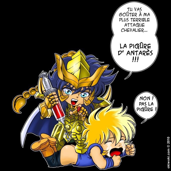 Hyôga a peur des piqûres d'aiguilles, et avec raison. Surtout si c'est Milo du Scorpion qui s'y colle...