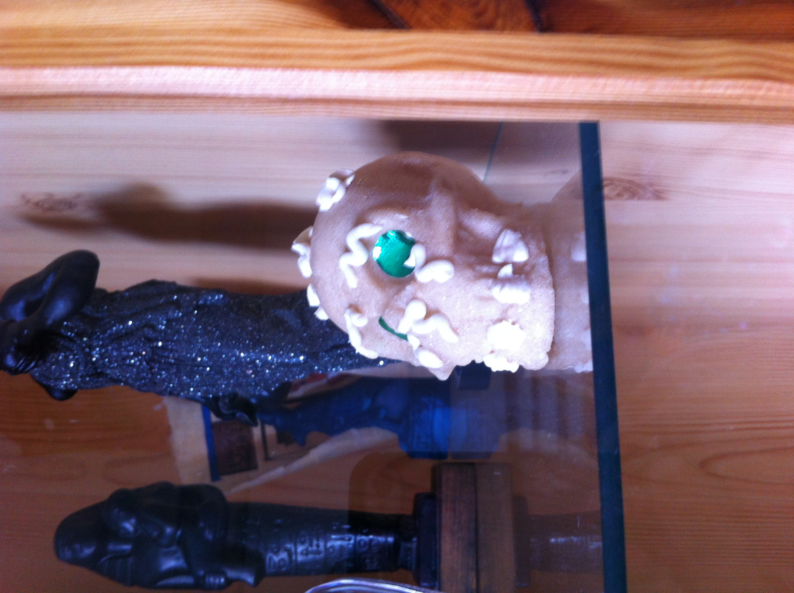 J'ai pris quand même deux photos: la première est une représentation végétale du Palais des Inscriptions de Palenque, la deuxième, un des diverses panneaux de directions dispersés dans la Foire Expo, assez sympathiques. Quant à la troisième, c'est une photo du crâne en sucre que j'ai ramené du Musée de l'Homme de San Diego, avec un pendentif en argent représentant la Pierre Du Soleil, réalisés par les artisans de la ville de Taxco, en 2001 .