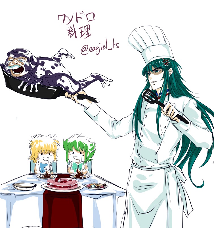 Toujours dans l'humour, un Camus cuisinant des cuisses de grenouilles Zélos, pour Hyôga et Isaac...
