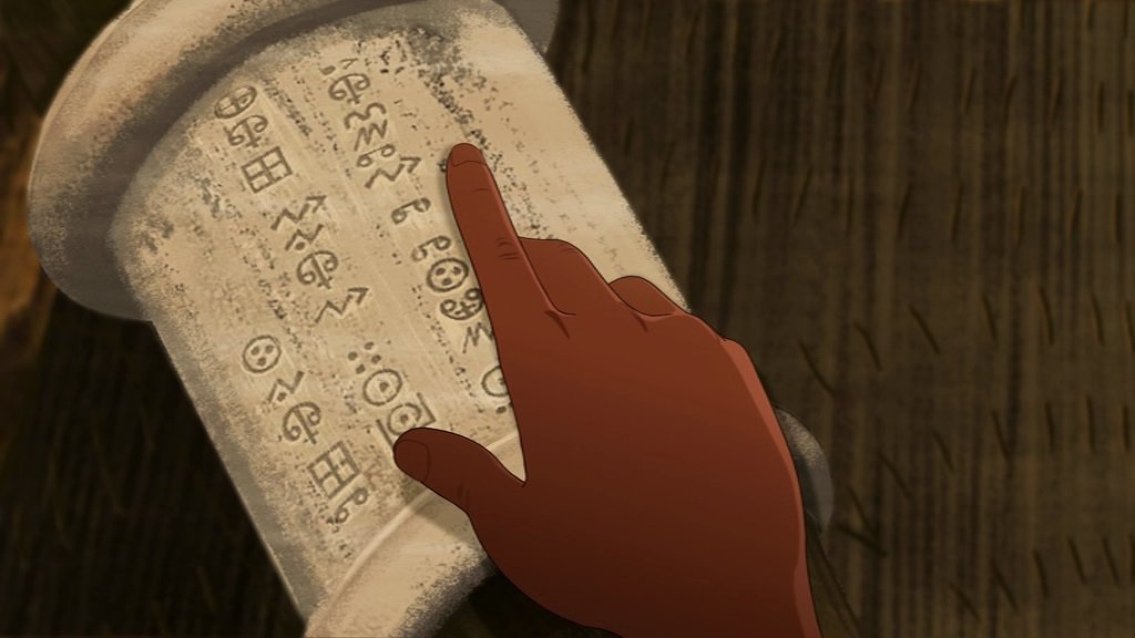 Il reste allongé un long moment, se grattant la tête, prenant parfois son encyclopédie. Puis, finalement, il sort et se relève en se massant le dos. « Même si les traits des idéogrammes y ressemblent un peu, dit-il à Esteban, ce n'est ni de l'atlante, ni du muen ! Je n'ai jamais vu cette langue...