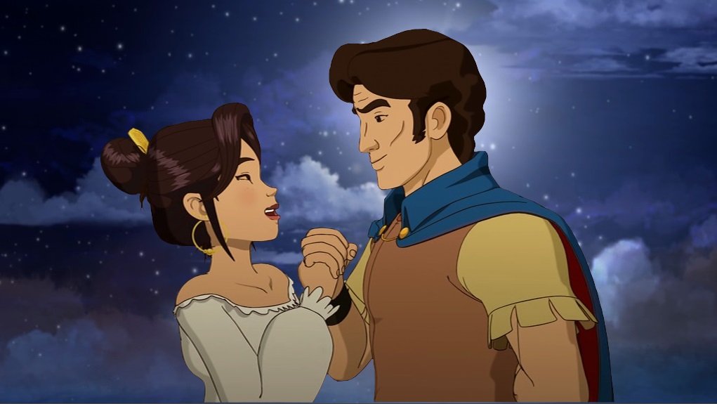 Pendant ce temps, Isabella et le navigateur se sont un peu éloignés des autres... Au dessus d'eux, le ciel est clair et les étoiles scintillent déjà. S'étant éloignés de la chaleur du camp, les deux amants frissonnent et se frottent les bras. La bretteuse est un peu nerveuse...