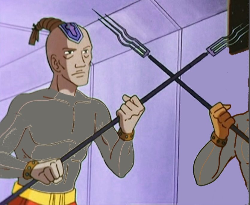 Ils se plaquent le long d'un mur et élaborent un plan le plus silencieusement possible. Au bout d'un moment, Pedro passe ostensiblement la tête et mettant les doigts en éventail sur sa tête et tirant la langue, fait une grimace à l'un des gardes. Ce dernier attire l'attention de ses congénères et tous quatre s'avancent vers le marin qui lui, pas fou, s'éloigne. Quand les soldats arrivent au niveau de Kushi, elle s'empare à deux mains de la lance du premier individu, qu'Athanaos assomme du manche de la sienne. Dans un même mouvement, la chasseresse applique violemment l'arme prise sur les jambes puis le cou du second ennemi, qui subit de plein fouet deux décharges d'énergie et s'écroule. Indali passe alors à l'action. Se glissant rapidement sous les jambes du troisième, elle attire par-là son attention et le fait se pencher tandis que Gaspard surgit devant lui, poings joints et lui donne un bon coup sûr l'arrière du crâne. Le guerrier s'effondre, tombant dans les pommes. Nullement intimidé ou déstabilisé, le quatrième adversaire commence à faire de grands gestes de son arme et tente d'embrocher l'hindoue, manquant Indali de justesse à plusieurs reprises. La jeune femme ne doit la vie sauve qu'à ses réflexes et son agilité. Heureusement, elle a déjà vu les maîtres d'armes de l'Ordre du Condor s'entraîner à de nombreuses reprises : elle laisse l'homme l'attaquer pour lui faire perdre son équilibre et quand la pointe de l'arme la rate et la dépasse, elle en saisit le manche déstabilisant ainsi le soldat. Ce dernier est plus fort qu'elle et Indali ne l'emmène ainsi pas loin, mais cela suffit pour que Sancho et Pedro se glissent sur les côtés de l'ennemi et le saisissent chacun par une épaule, l'empêchant de combattre et le forçant à lâcher sa lance. Le garde s'apprête bien à hurler pour donner l'alerte, mais Sancho lui coince son bonnet dans la bouche, étouffant son cri ! Gaspard profite de l'instant de stupeur du garde pour lui décocher un splendide direct, qui lui règle son compte.