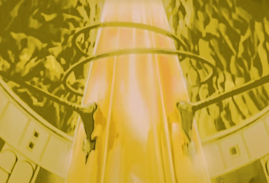 La chasseresse passe à nouveau en première position, suivant les conduites et les amis arrivent finalement devant une porte close. Kushi colle son oreille tout contre, afin de déterminer s'il y a du bruit, mais le pan d'orichalque est trop épais : elle n'entend rien. Elle fait signe aux autres de se tenir prêts et Gaspard dégaine son épée puis, elle ouvre la porte. A leur grand soulagement, la pièce n'est pas occupée. Elle est très bien éclairée. Trop même : tous sont un instant éblouis par la vive lumière blanche émanant d'une multitude de petites lampes incrustées dans des conduites noires, elles-mêmes encastrées dans les murs. A ce rayonnement s'ajoutent en outre des reflets sur l'orichalque, omniprésent. Un immense tube vertical se dresse près de la paroi située tout au fond. Il est continuellement parcouru d'éclairs jaune vif. La colonne est entourée d'écrans et de consoles.