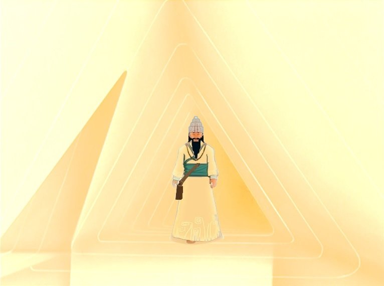 L'individu est plutôt grand et arbore la tenue des naacals, chapeau, robe et sandales... Sa peau est couleur d'ébène, ses cheveux noirs et il porte une longue barbe tressée de la même couleur. Il a des petits yeux malicieux et un nez mutin. Il ne paraît pas si âgé que les conseillers de Mû auxquels les garçons ont déjà eu affaire sous forme de lumino-projections, ou même en chair et en os dans le cas d'Esteban. La silhouette n'est pas une illusion visuelle : elle se déplace normalement et s'approche de Tao, tandis que Yesubaha et ses guerriers s'écartent à son passage puis reculent. Sur le flanc droit, le nouveau venu porte une petite sacoche brune suspendue à la ceinture... En avançant il en extrait une petite tablette.
