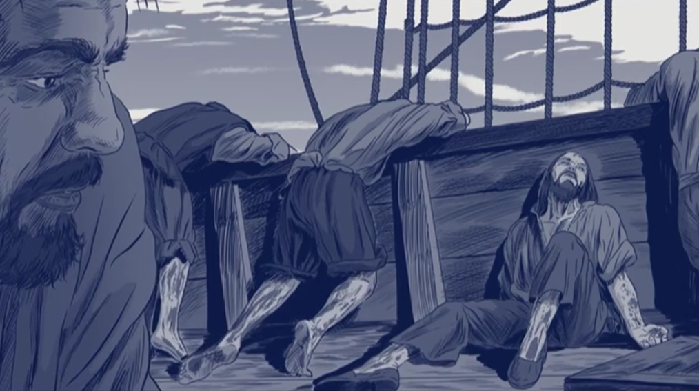 :Mendoza: : Oui. Nous demeurâmes durant tout ce temps sans prendre de vivre et autre rafraîchissement. Nous ne mangions que du vieux biscuit tourné en poudre, tout plein de vers et puant l'urine que les rats avaient faite dessus. Nous dévorions les cuirs en peau de bœuf qui étaient sur le grand mât et qui étaient très durs à cause du soleil, de la pluie et du vent. Nous en vînmes même à faire de la soupe aux copeaux de bois trempée dans de l'eau de mer afin d'apaiser nos estomacs qui criaient famine. Mais il y avait pire: nous en étions réduits à attraper les rongeurs afin de consommer un peu de viande.