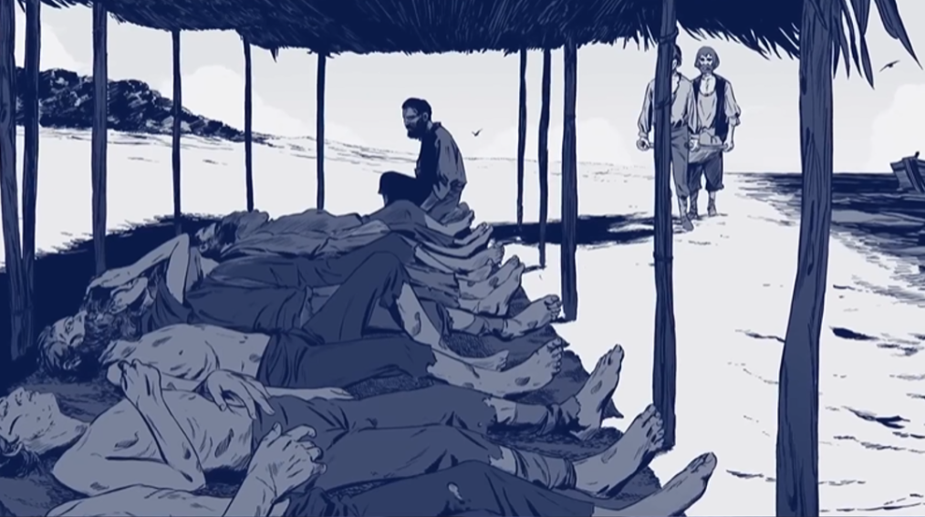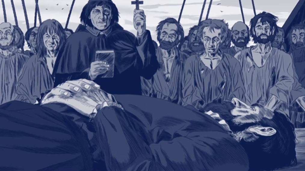 :Mendoza: : C'est bon à savoir. Mais avec le grand condor pour se rendre d'un point à un autre aussi rapidement, je ne suis pas prêt de reprendre la mer. Et je comprends à présent pourquoi tu aimes tant boire de ce lassi... Bref, presque chaque semaine, nous devions faire basculer un corps sur une planche graissée ou du moins, tant que les marins n'avaient pas eu l'idée de lécher le suif dessus. Entre le 23 décembre 1520 et le 28 février 1521, Alonso de Mora, Domingo de Coimbra, Diego de Peralta, Gonzalo Rodríguez de Triana, Rodrigo Hernández Rodríguez, Miguel Veneciano, Nicolás Genovés, Juan Flamenco et Vasco Gallego trouvèrent la mort, avec l'océan pour dernière demeure. Mais aussi étrange que cela puisse paraître, cette longue traversée fut moins mortifère que prévu.