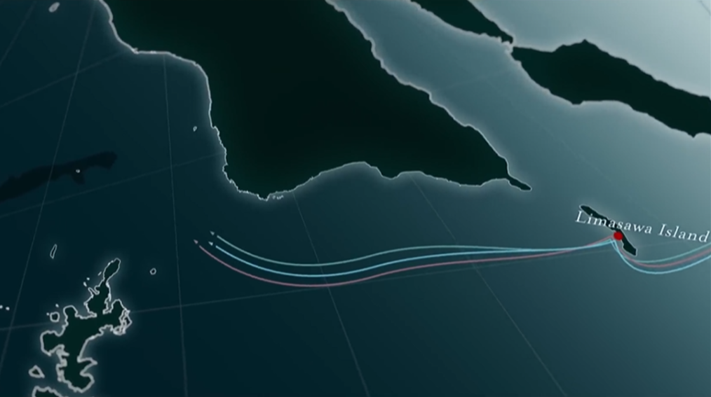 "Pendant trois mois et vingt jours, nous avons traversé quatre mille lieues par cette mer Pacifique, (en vérité, elle est bien pacifique, parce qu'en ce temps nous n'aurions pas eu fortune) sans jamais voir de terre, sinon deux petites îles inhabitées, sur lesquelles nous ne trouvâmes rien d'autre qu'oiseaux et arbres. Nous les appelâmes les îles Infortunées. Elles sont éloignées l'une l'autre de deux cents lieues. Impossible de trouver de fond à côté d'elles. La première, l'île San Pablo, aperçue le 24 janvier 1521, est à quinze degrés de latitude dans l'hémisphère sud. L'autre, que j'appelle en Italien "isola de tiburoni", l'île des requins, découverte le 04 février, est à neuf degrés. Chaque jour, nous faisions soixante à soixante-dix lieues en avant".