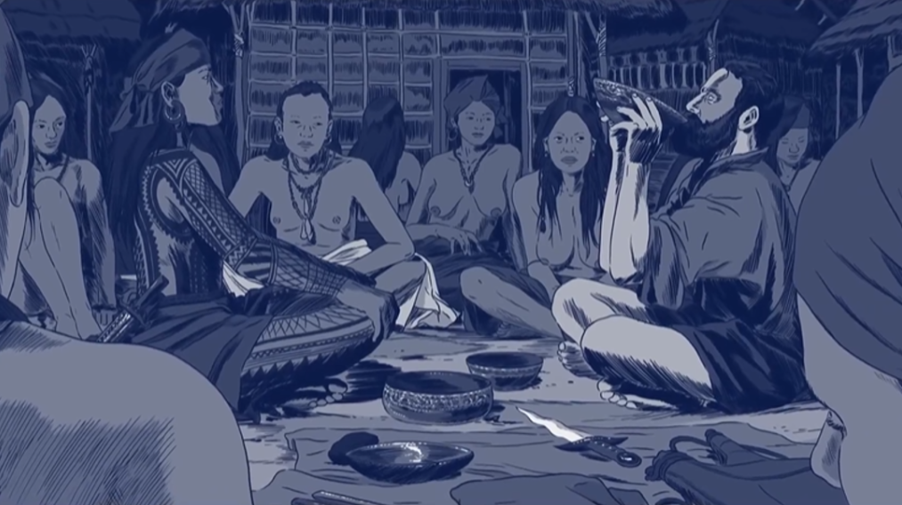 :Mendoza: : Non, je ne m'en souviens pas! Mais soit, ce n'est pas le plus important. En tout cas, ce sont bien deux membres de la nef amirale qui eurent le privilège de suivre Kolambu qui, d'après l'Italien, était un très bel homme. Le chroniqueur raconta qu'il avait le corps tatoué, bien huilé, qu'il portait beaucoup de bijoux. À la cour du Radjah, Pigafetta passa surtout du temps à festoyer et apprendre du vocabulaire local. Il nous donna une curieuse description de l'habitation royale, des banquets auxquels il assista, des mets qui entraient dans leur composition, des cérémonies auxquelles on procédait toutes les fois qu'on vidait une tasse de vin. D'ailleurs, son acolyte avait surtout bu sans retenue jusqu'à s'enivrer.