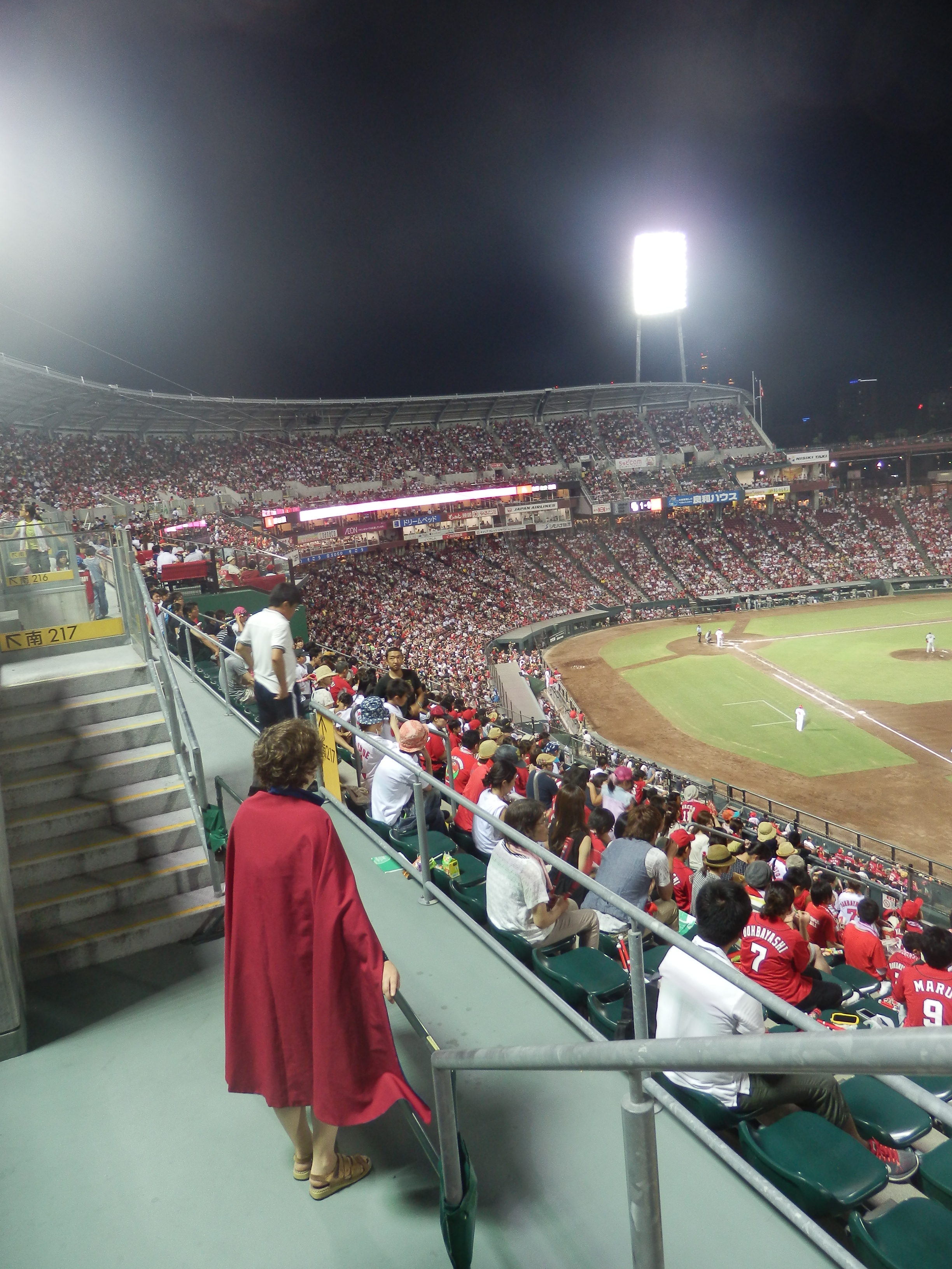 D'ailleurs, Mendoza a tourné casaque (enfin, cape), pour se mettre aux couleurs des Carps, lors d'un match placé sous le signe de la Paix, à quelques jours de la Commémoration du 6 Août. Ambiance festive garantie, la cape est même entrée dans une 'Ice Box' à moins dix degrés (il faisait plus de 30 au dehors) où on conserve des sculptures à l'effigie des joueurs de l'équipe et des objets cultes (balles, battes, casquettes..). Ils sont fous ces Japonais! x-)