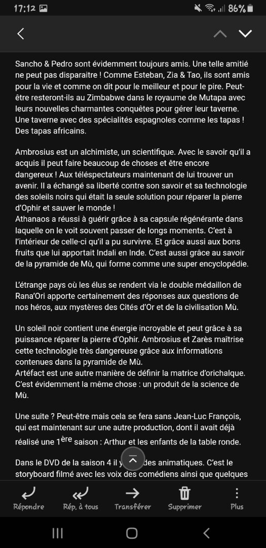 Bizarre, seuls Chalopin et Deyriès en ont parlé. A ma connaissance Kaneko n'a jamais approuvé ni écrit de suite. Demande à Viracocha, il devrait t'en dire plus.dialecte a écrit : 11 janv. 2021, 22:19 Le scénario approuvé par kaneko était de poursuivre l'aventure en Californie et ensuite l'Alaska.