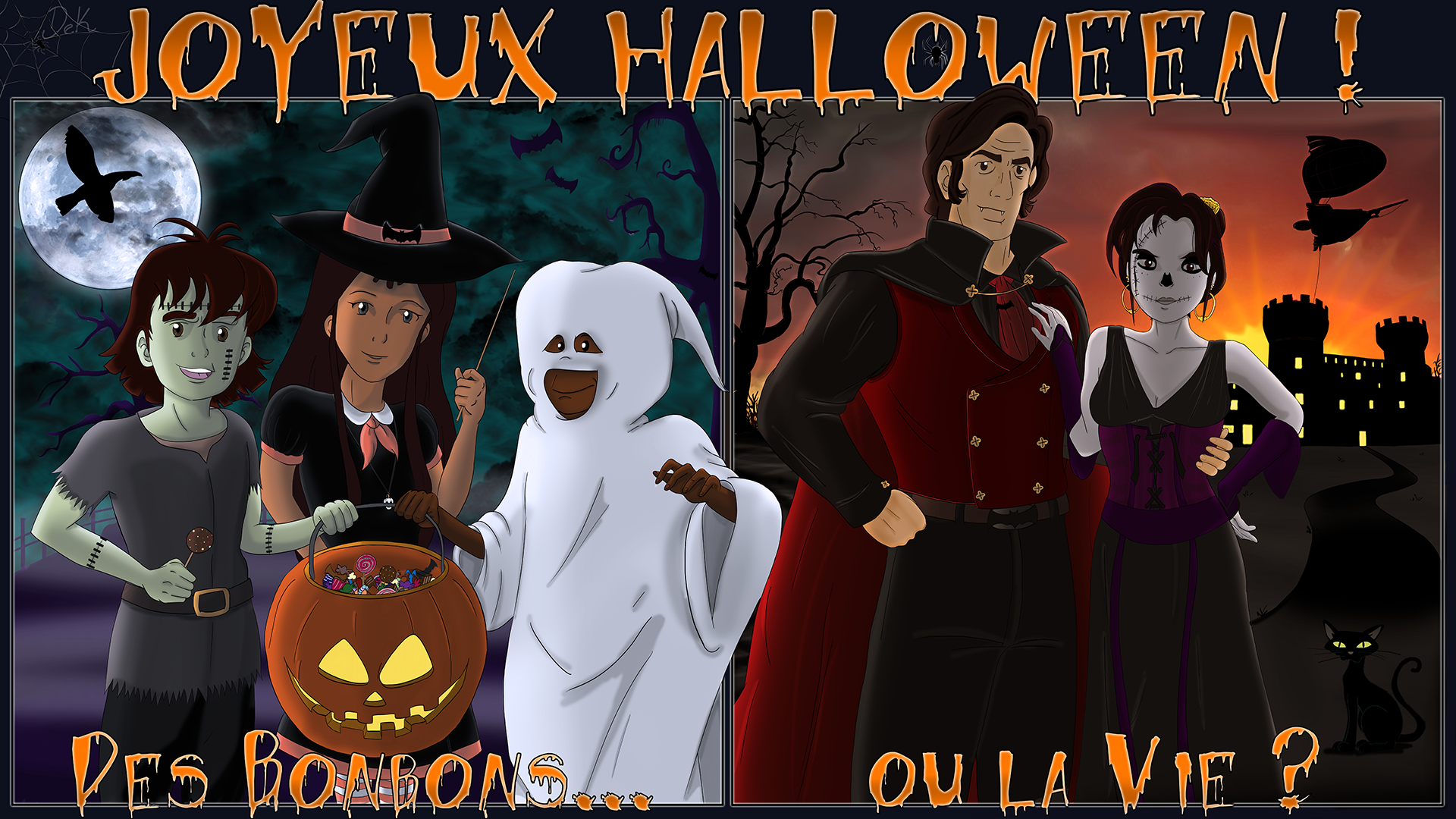 Waw ! Autant je déteste Halloween (pour moi c'est une fête de m****, en passant (chacun ses avis ^^)), autant je peux te dire que ce dessin (dessin-montage ?) est vraiment pas mal du tout ! Peut-être ton meilleur jusqu'à présent !