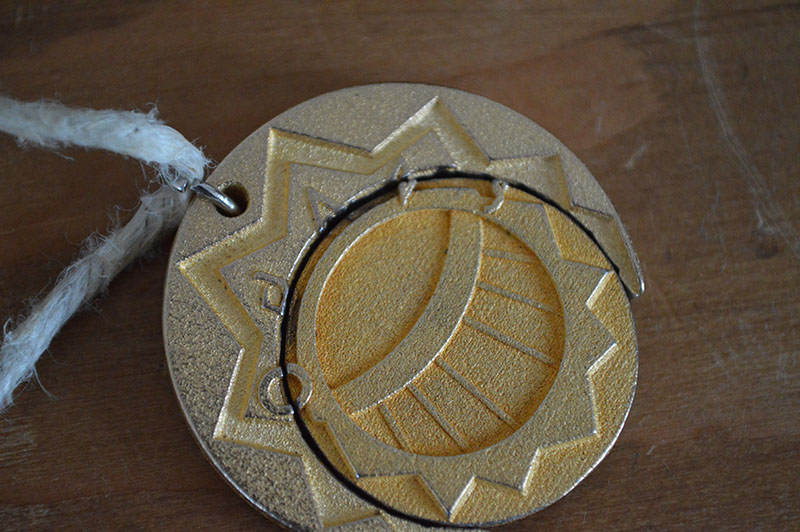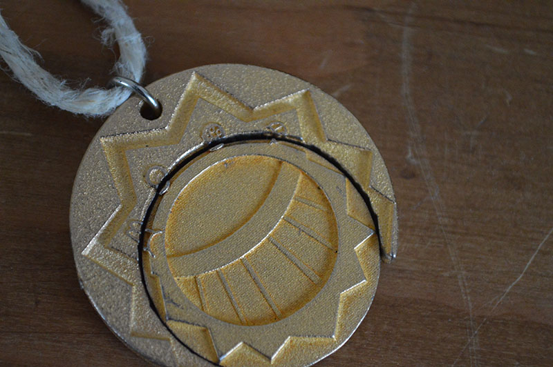 Bonjour, j'ai modélisé en 3D le médaillon du soleil avec ses deux faces (recto et verso) ainsi que les 2 inscriptions mus différentes les plus fréquentes dans la série animée. J'ai ensuite fait appel à un service d'impression 3D en ligne afin d'imprimer en 3D, en acier couleur or, les deux parties du médaillon. Des aimants ont aussi été rajouté afin que la clé des cités d'or ne puisse pas se perdre...